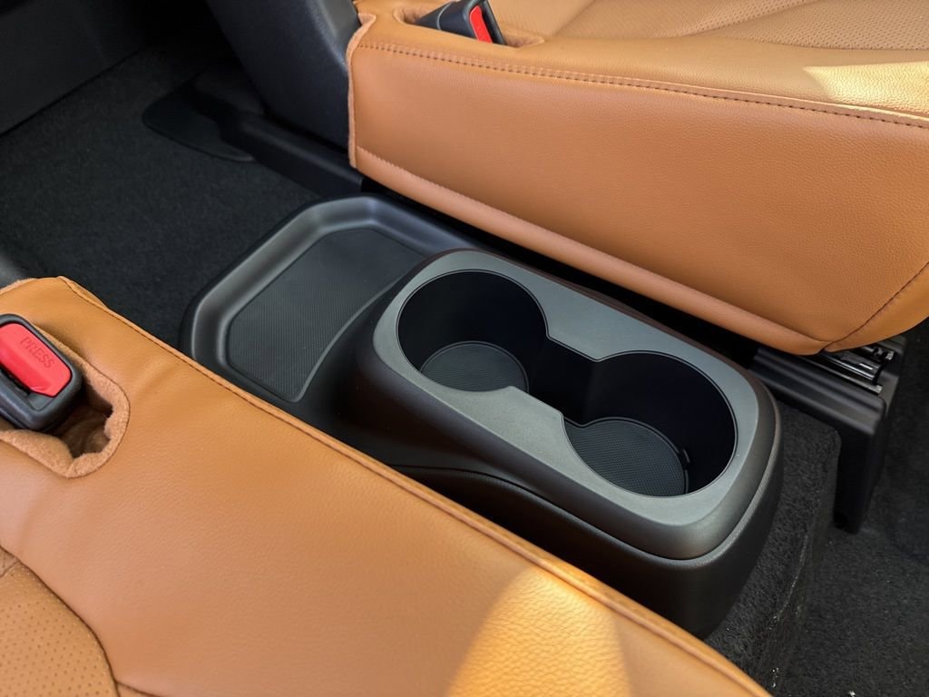 7-passenger seating with second-row fold-down captain's chairs and fold-down inboard armrests, adjustable headrests and two cup holders mounted on the floor; and 60/40 split, fold-flat third-row seats with sliding headrests and recline function.